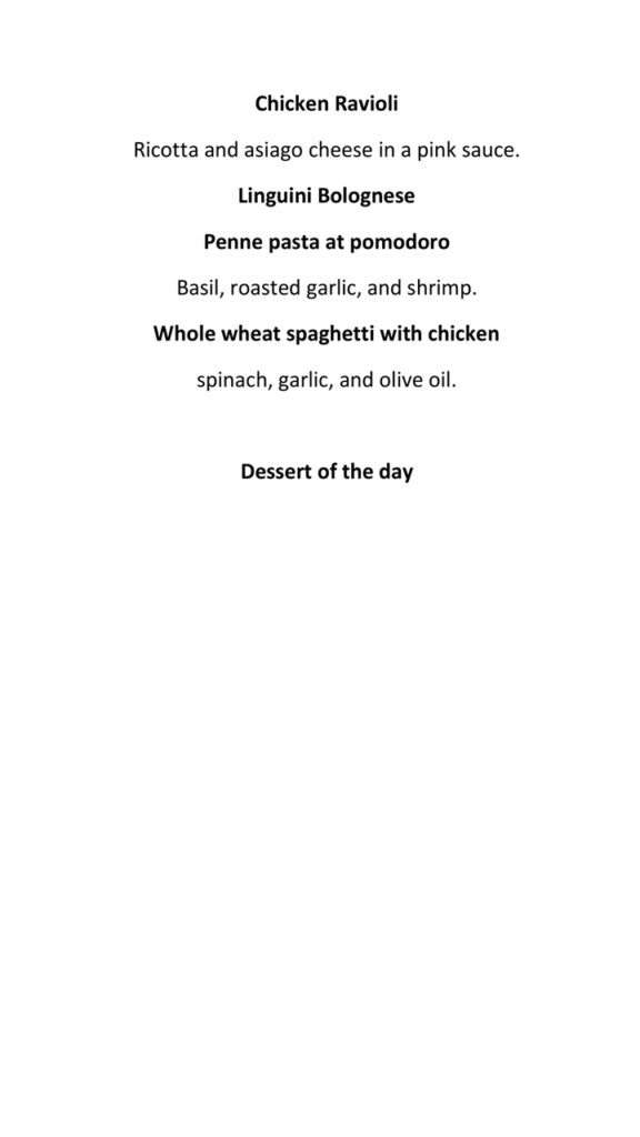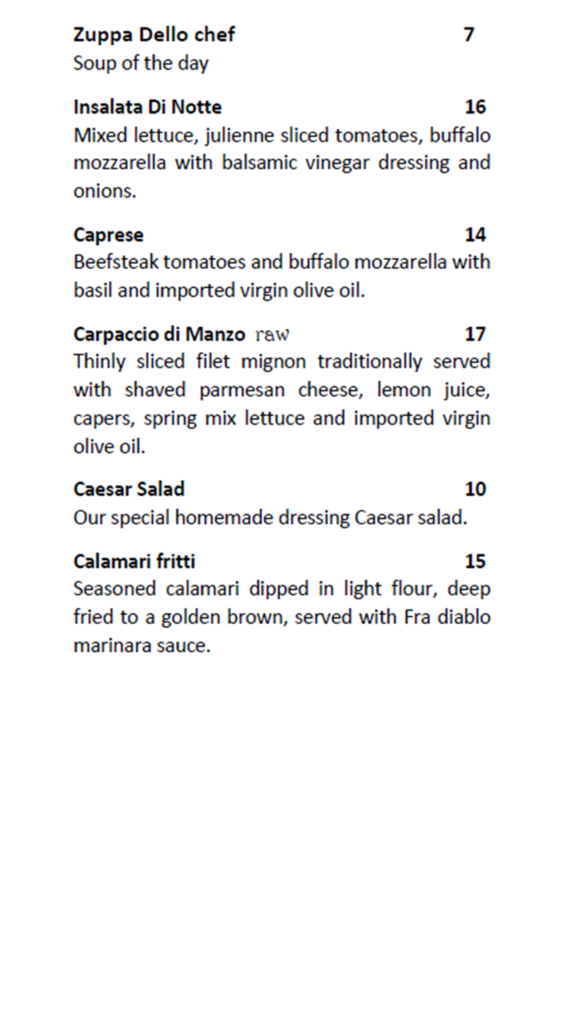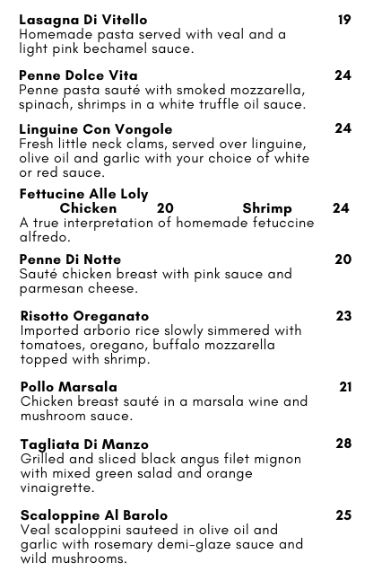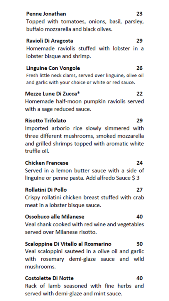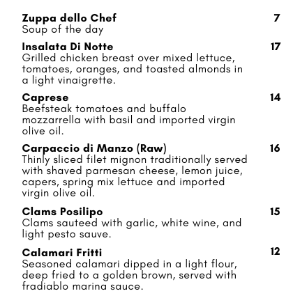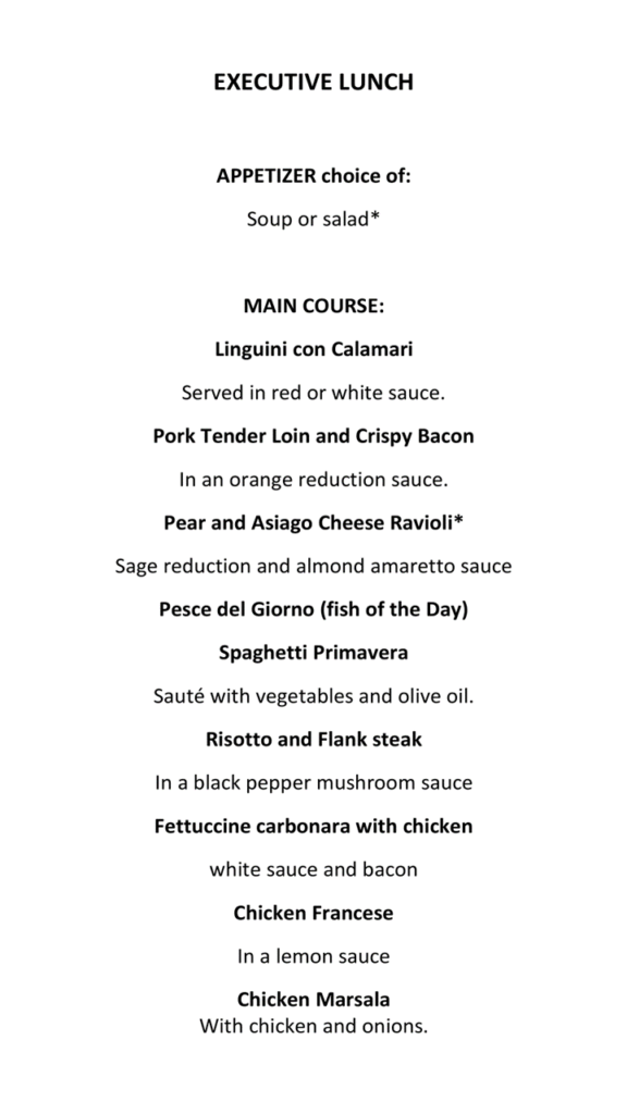 Lunch Menu Appetizers Entrees Executive Lunch Menu Comes with a choice of appetizer, entree, and dessert.$25 + TAX + TIP Dinner Menu Appetizers Main Courses